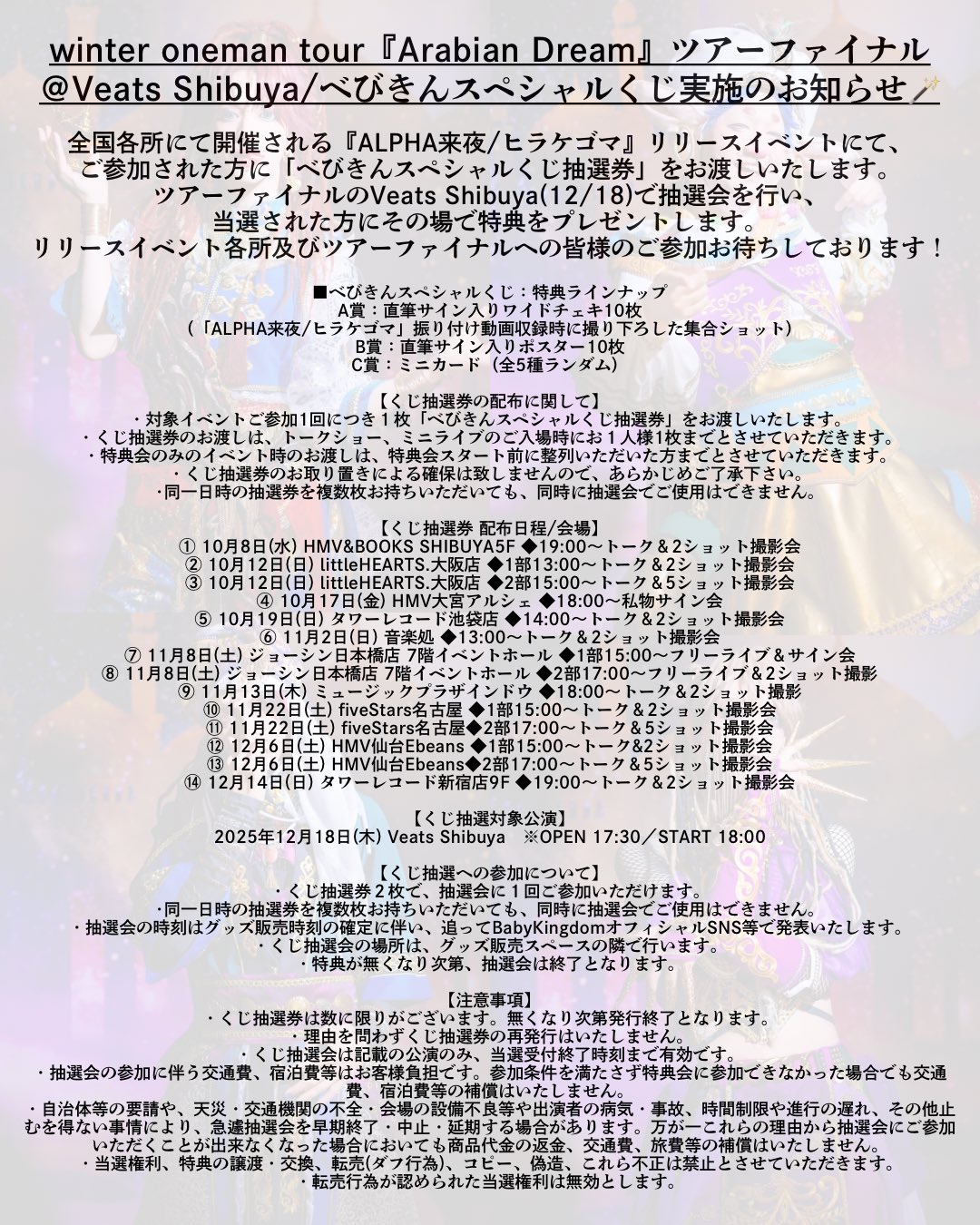 『Arabian Dream』ツアーファイナル(12/18)Veats Shibuya「べびきんスペシャルくじ」実施NEW