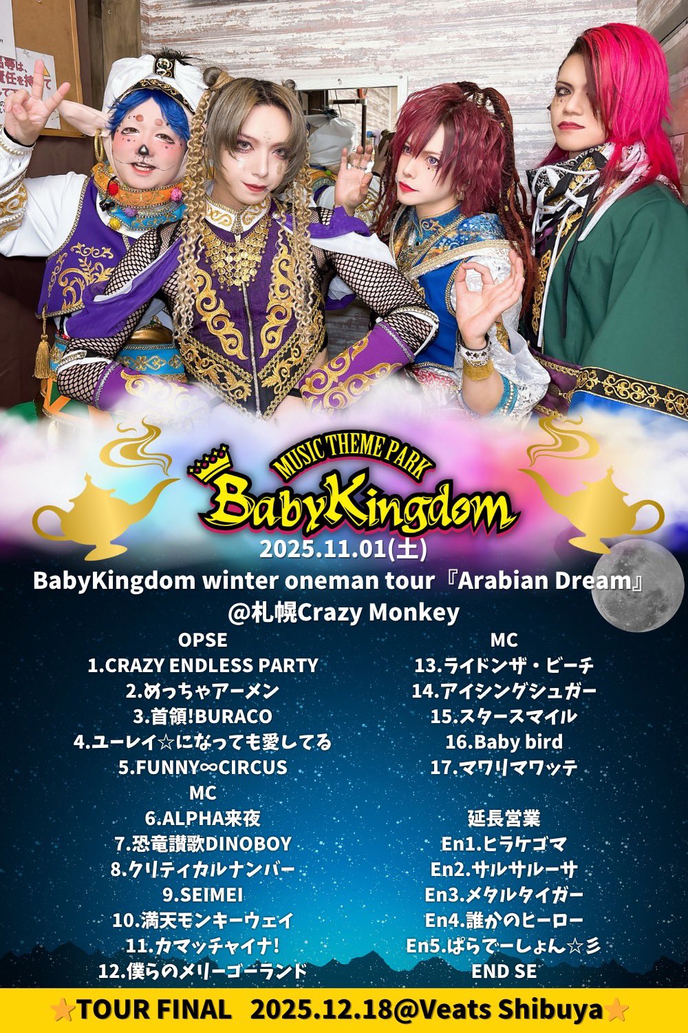 | 1 【ワンマン 札幌Crazy Monkey】 winter oneman tour 『Arabian Dream』https://babykingdom.jp/setlist-images/set-list2025-07-12/20251101.jpg |