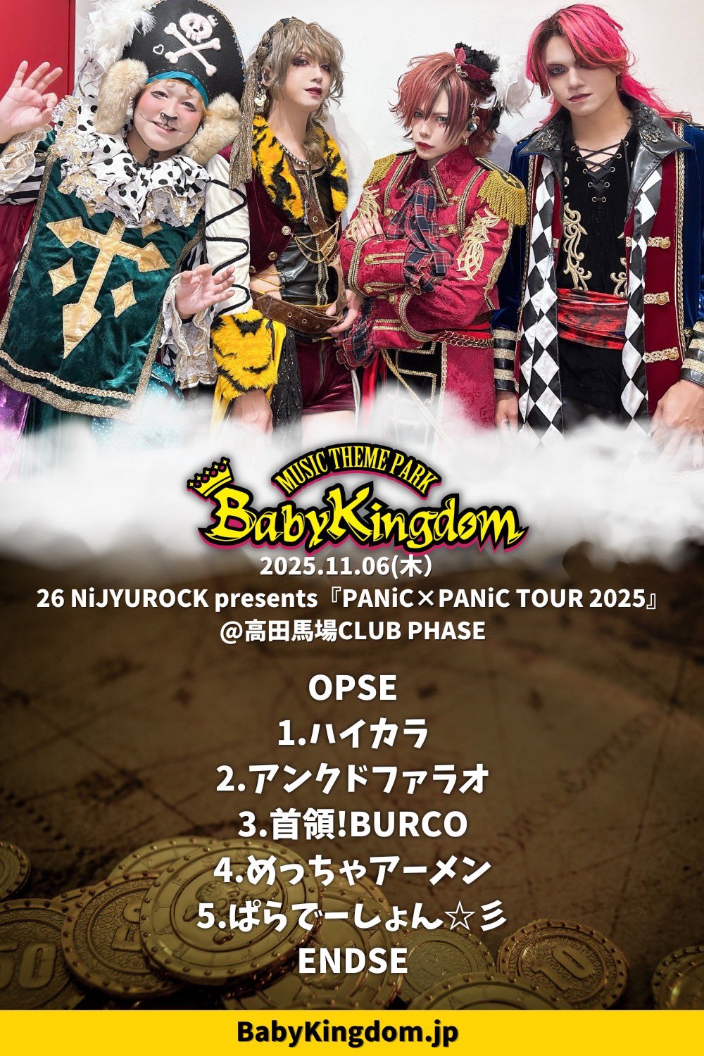 3 文化の日 | 4 | 5 | 6 【イベント 高田馬場CLUB PHASE】 26 NiJYUROCK presents『PANiC×PANiC TOUR 2025』https://babykingdom.jp/setlist-images/set-list2025-07-12/20251106.jpg |