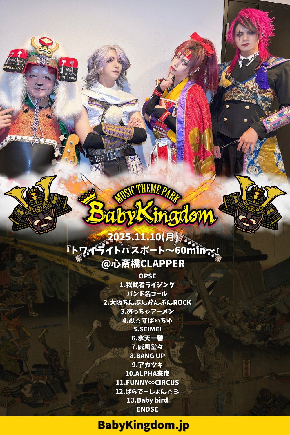 10 【ワンマン 心斎橋 CLAPPER】 BabyKingdom ONEMAN LIVE『トワイライトパスポート〜60min〜』https://babykingdom.jp/setlist-images/set-list2025-07-12/20251110.jpg |